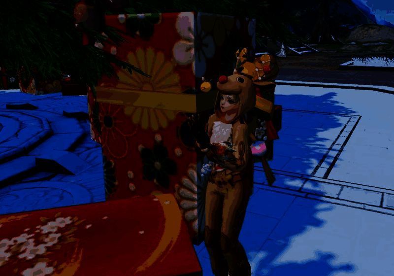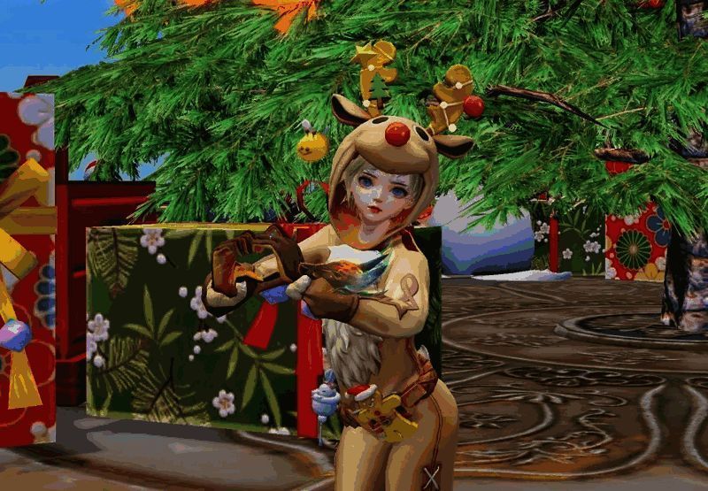 起猛了!圣诞老人的驯鹿迷路到大荒了!身穿【驯鹿奇缘】的少侠仿佛雪域森林中的小驯鹿幻化为人形,一双珊瑚状对称的鹿角竟是以姜饼制成,上面还挂着星星与圣诞树,别具巧思。兜帽上圆滚滚的大眼睛和红鼻头更是将驯鹿的呆萌可爱展现得淋漓尽致~身后圣诞树上也是装扮一新,一串串彩灯装点着树桠,缤纷而浪漫,树旁各式礼盒堆积如山,似乎正等待着小驯鹿打包带走~