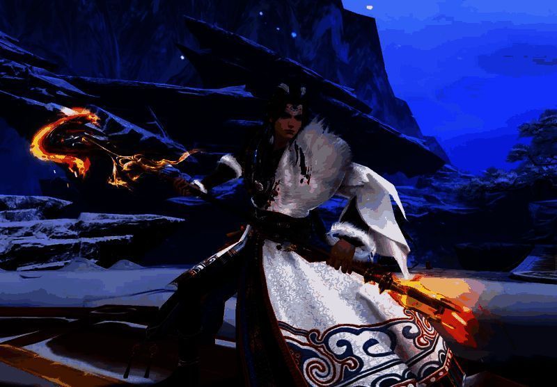 少侠脚踏马步手举长刀,英武之势仿佛可将雪山点燃!