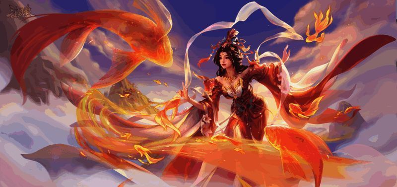 金光闪耀,芳泽沐鲤!裙摆摇曳多姿,头饰璀璨夺目,金色锦鲤环绕在族吴苋周围,天边的彩云将族吴苋的温柔表现的淋漓尽致。