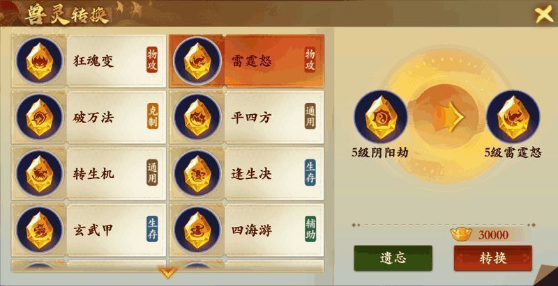 兽灵(普通和特殊)都可以花3w元宝转换成其他兽灵,等级不会重置,也就是说可以比较灵活的应对不同的使用场景。