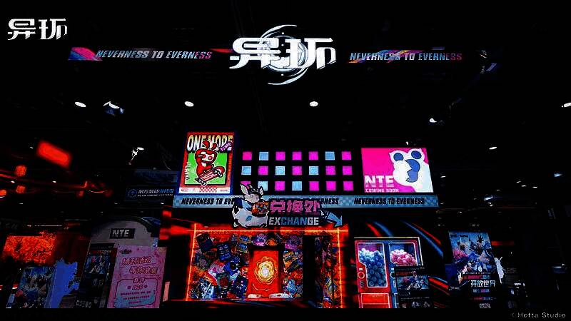 展位还原了游戏内海上列车、痛车工房、潮玩店、画框异象等多个场景,将海特洛市的霓虹闪烁与异象元素有机融合,让玩家一秒置身于游戏中的超自然都市之中。