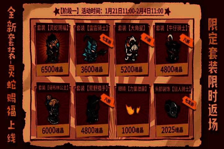 全新蛇年新春特效套装-金蛇赐福上架,售价6500魂晶,买一送一,购买赠送套装鹰骑士;全新玩家设计套装-哥布林公主上架,售价6000魂晶,买一送一,购买赠送(面具)哥布林国王。另外还有往期活动外观轮换返场,宝藏猎人们不要错过啦,请及时兑换喜欢的外观吧!