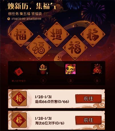 新春到,做任务,集五福,领福袋!1月18日00:00~2月2日23:59期间,完成对局任务可以集福,集齐指定数量的"福"可在活动界面领取对应奖励,注意本次活动未领取的奖励不会补发,请务必前往奖励界面领取。