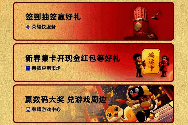 游戏用户也有福啦!荣耀游戏中心精心策划多重游戏活动放送福利——1月24日起,新用户通过荣耀账号登陆指定游戏,即可自动领取满6减5.99优惠券1张,享最低0.01元首充礼;即日起进入腾讯游戏专区做任务领取元宝,参与砸金蛋、逛庙会可抽取或兑换数码产品大奖及游戏周边,机会有限,先到先得!此外,完成签到和活动任务赚取金币,不仅能兑换精美好礼,更有机会抽取千元红包——用户可在荣耀游戏中心APP点击福利页活动卡片参与,除夕-初七每晚20:00-23:59还有现金红包发放,先到先得,开启好运蛇年!