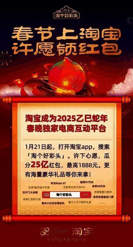从1月21日起,全国网友打开淘宝app(应用程序),搜索“淘个好彩头”可以直达活动页面。只要许下你的新年心愿,就能瓜分25亿红包,还有机会实现愿望,赢得包括汽车、手机、演唱会门票等在内的实物大奖。