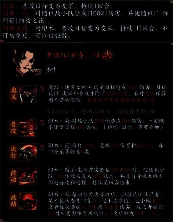 被动Ⅱ:幻术·彩:每回合首次普攻后,驱散己小队忍者1层不良状态并回复15%忍术生命值。己小队木叶忍者每次造成纯忍术或纯体术伤害,攻击者成长12%对应类型体忍术属性。7次后触发幻术·彩。