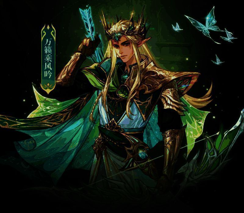 男性时装名为“万籁乘风吟”,一头淡金色的长发,身披装饰着绿叶的铠甲,手持弓箭,仿佛是这座森林最忠实的护卫者,英勇而无畏。