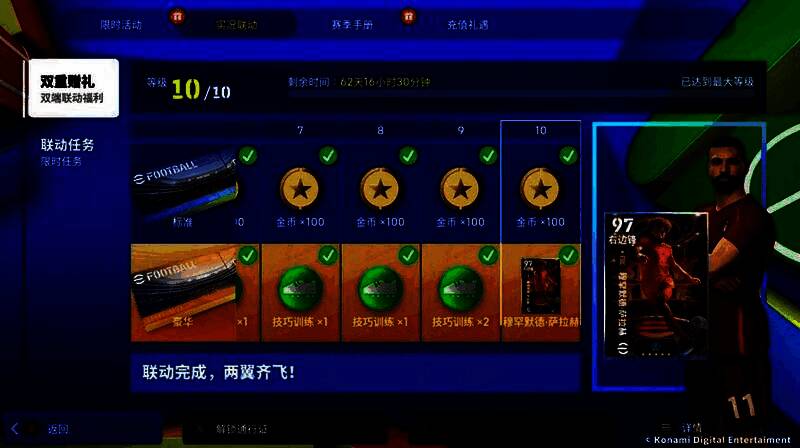 实况足球双端联动通行证任务重磅开启!完成通行证任务,获得经验值后可领取通行证等级奖励。免费版通行证,满级后可获得【金币】*1000;花费点卡解锁豪华版通行证,满级后可额外获得【技巧训练】*10和【梦幻增能精选萨拉赫】*1。