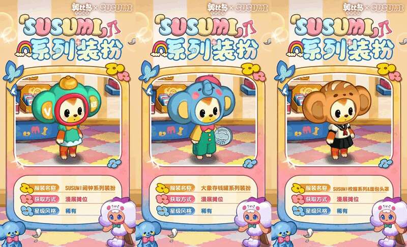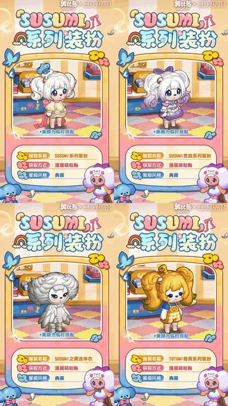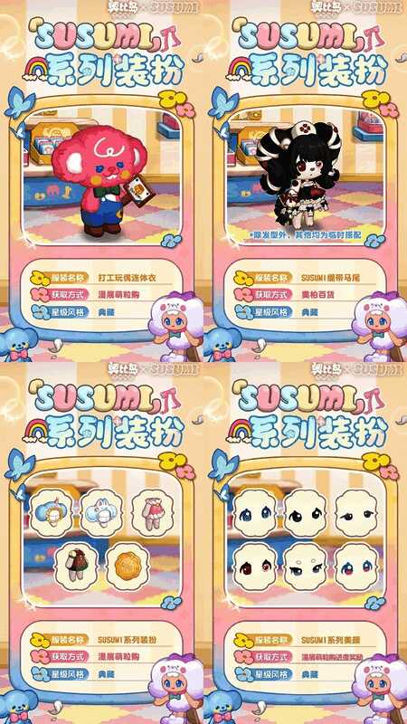 参与「漫展萌粒购」限时活动可获得活动限定奖励,奖励包括「SUSUMI瓷器裙」「SUSUMI贵宾绒裙」等限定装扮,还有「SUSUMI衣帽柜」「SUSUMI玩偶沙发」等限定家具散件,全新的头像框「快乐酥酥米」、背景卡「SUSUMI展会背景」,双人座椅「SUSUMI宝贝软垫」、动作「爱心亲签」及晨星品质称号等超多惊喜礼物!
