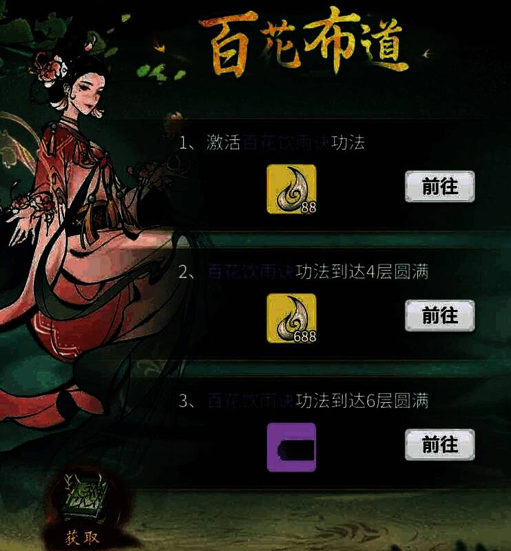 玩家参与兰华初绽、听花仙塔等活动,可获取限定功法“百花饮雨诀”。