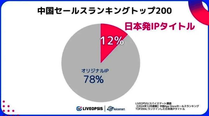 近年来日本动漫IP改手游市场竞争愈发激烈,根据日本数据研究机构Spice Mart近期发布的报告显示,2024年12月中国iOS畅销榜TOP200中,来自日本IP的手游占比为12%,相较去年同期下降3%。