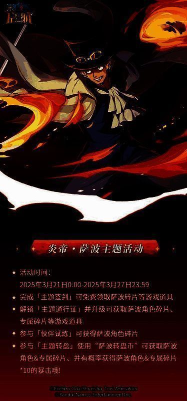 炎帝·萨波伙伴定位为中排·火系·控制·治疗。炎帝·萨波自身的能量获取不会被无效化,且治疗量与治疗效率均不受外界影响;入场后对自身以外的队友施加【星火】,持续60秒;为处于【星火】状态的队友分担10%伤害;场上每有存在1个【星火】,炎帝·萨波将获得15%绝对减伤;若入场后我方伙伴均带火系标签或触发【三兄弟】,处于【星火】状态的队友受到的暴击伤害减少20%。推荐阵容:和之国大妈、烬、炎帝·萨波、火拳·艾斯、凯多。顺带一提,火拳·艾斯也迎来了全新突破,潜能之力正式开放,焰火燃烧得更加炽烈,战斗力再攀巅峰!即日起至3月27日,参与活动即可获取大量好礼哦!