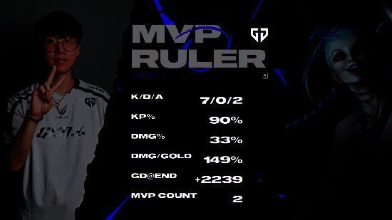 决胜局前期,T1状态火热,三线压制并成功入侵野区由Oner拿下一血,上路德莱文更是完成“提款”扩大优势。GEN陷入巨大被动,前期节奏近乎崩溃。然而,比赛在23分钟迎来惊天逆转:T1关键上单多兰进场失误先倒一人,GEN的Ruler金克丝抓住机会开启收割模式,帮助队伍打赢团战并拿下小龙,一举夺回主动权。士气大振的GEN在25分钟果断Rush掉厄塔汗,并在随后的团战中由金克丝斩获双杀,顺势拿下大龙,彻底扭转局势。蛰伏许久的Ruler金克丝在后期团战中火力全开,GEN全员全力保障其输出环境。最终,凭借金克丝的超神发挥,GEN成功翻盘,击败T1,率先晋级MSI决赛。