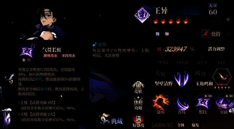 首先,王异的天赋“坚壁清野”可谓是她的核心亮点之一。每当她回合结束,或队友在回合外普攻时,都会为自己叠加一定层数的专属增益“蓄势”。这个蓄势能够显著提升她的物理增伤效果,使她在战场上的伤害输出更加爆发。简单来说,王异的每一个回合都充满了蓄势待发的潜力,这让她在面对敌人时,能够精准打击,展示出强大的威慑力。