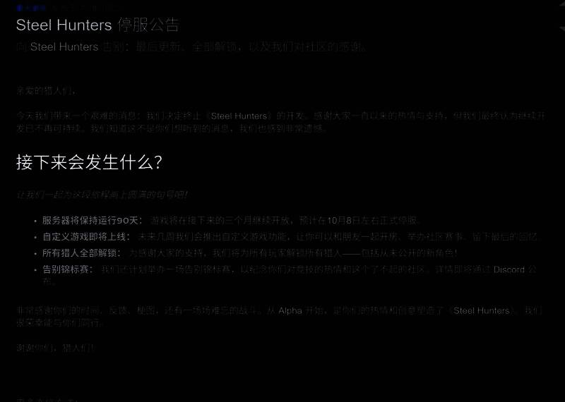“今天我们带来一个艰难的消息:我们决定终止《钢铁猎手》的开发。感谢大家一直以来的热情与支持,但我们最终认为继续开发已不再可持续。我们知道这不是你们想听到的消息,我们也感到非常遗憾。。”