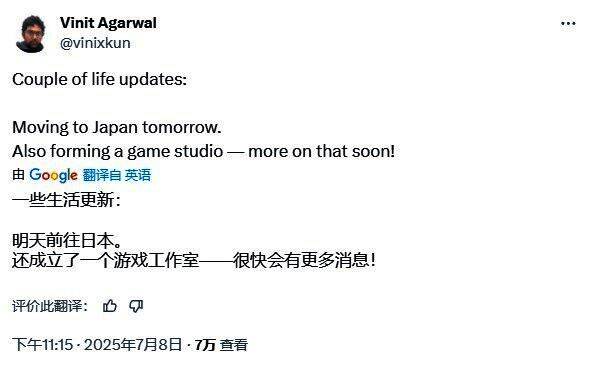 前顽皮狗资深游戏总监维尼特·阿加瓦尔(Vinit Agarwal)于7月8日宣布,将在日本成立全新游戏工作室。这位参与开发《神秘海域》《最后生还者》系列的元老,曾主导已夭折的《最后生还者Online》项目,在2023年12月该项目被取消后,于今年初离开效力十年的顽皮狗。
