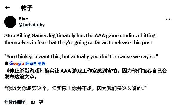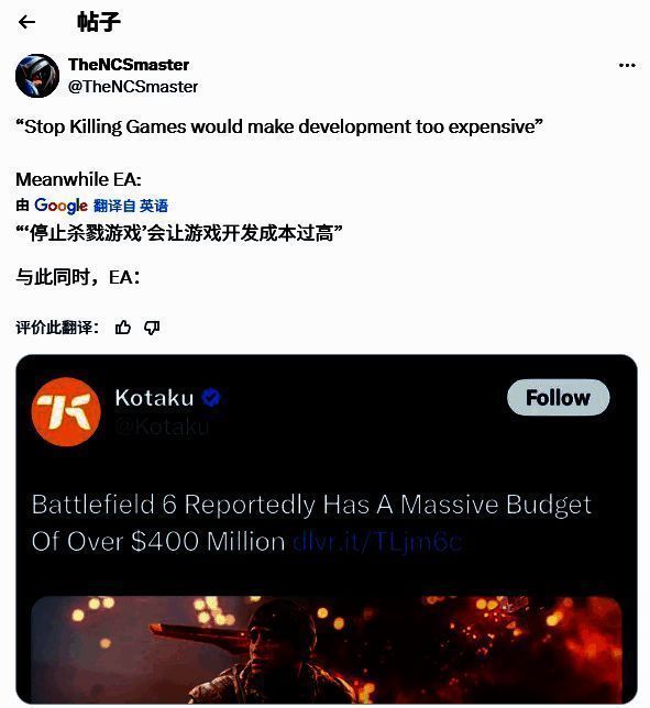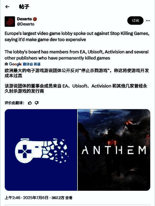除了Scott,也有大量玩家及业内人士回应了这份行业声明,称其反而给运动带来了更多关注与正当性。尤其是在EA宣布彻底关闭《圣歌》后,该运动的核心议题再次被推至舆论风口——该游戏一旦服务器关闭,将彻底无法游玩,且玩家无法获得退款。部分玩家呼吁EA至少添加离线模式,但目前来看,这一可能性极低。