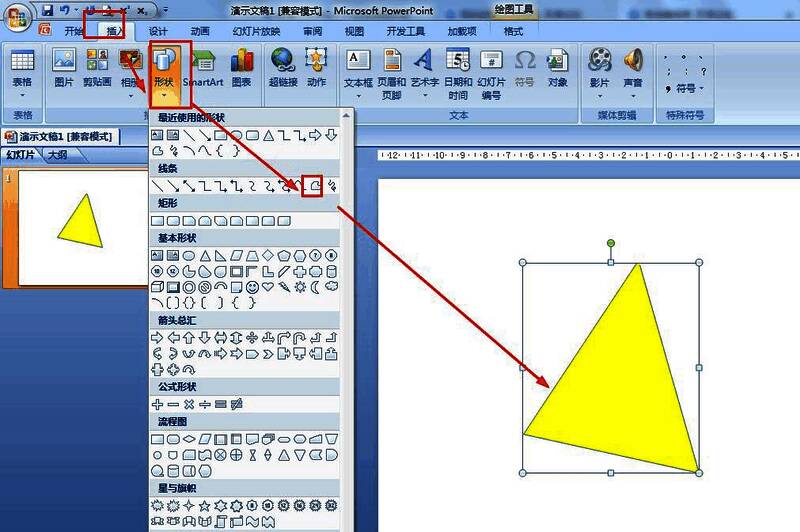 点击开始——在绘图中再选择任意多边形在右侧再画一个侧面的三角形其中一条边与左侧三角形的边相接合。