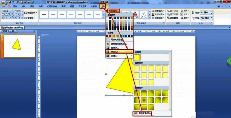 开始——形状填充——渐变——其他渐变——渐变填充——预设——选择彩虹——点击关闭。