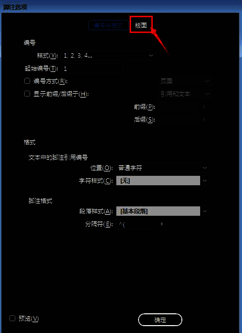 2.然后,在打开的脚注选项设置面板中,将窗口切换到版面一栏