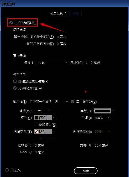 3.最后,找到其中的栏间跨区脚注按钮,鼠标点击取消勾选即可