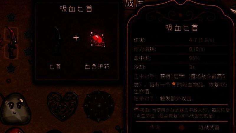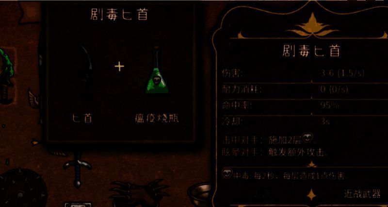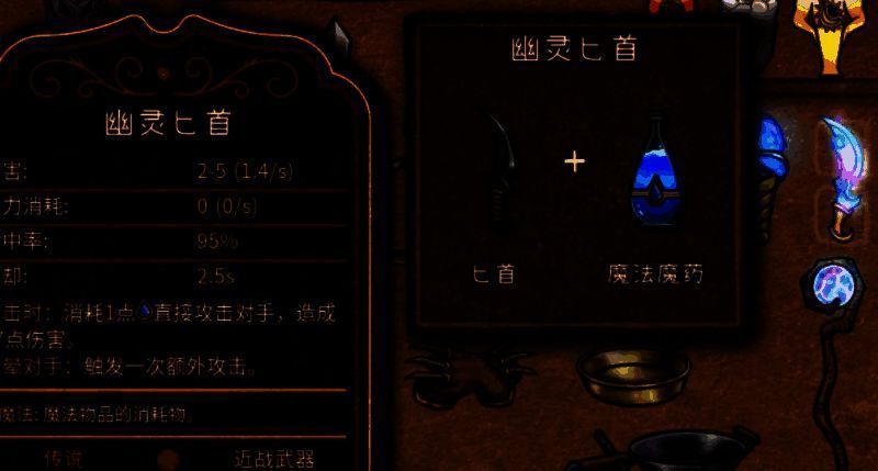 除了幽灵匕首好用以外,游戏中还有2中非常好用的匕首,分别是吸血匕首和剧毒匕首,吸血匕首需要用匕首以及血色护符来合成,剧毒匕首则需要匕首和瘟疫烧瓶了。
