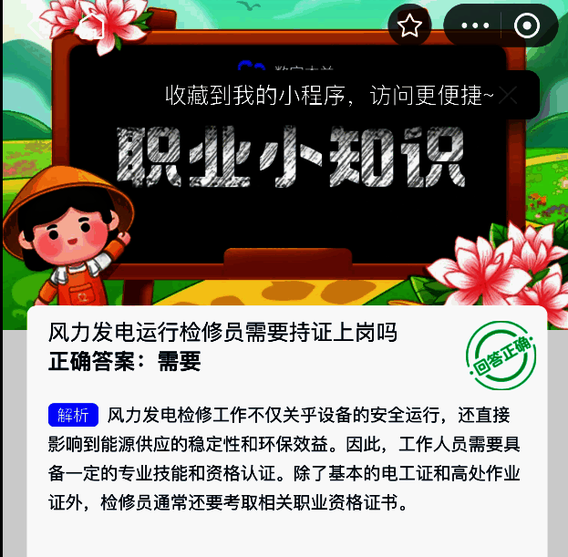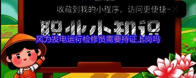 风力发电运行检修员需要持证上岗吗?这是支付宝蚂蚁新村2025年7月11日题目,每天在蚂蚁新村答题,可以提高木兰币的产速,帮助小镇建设。点击正确答案,会获得“产速+3/时”更多的奖励。今天正确答案是【需要】。风力发电检修工作不仅关乎设备的安全运行,还直接影响到能源供应的稳定性和环保效益。因此,工作人员需要具备一定的专业技能和资格认证。