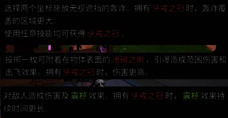 大招“天谴轰炸”的加点需分阶段。第一次升级选择“多重打击”,将轰炸坐标从2处增至3处,实现更广区域压制,第二次升级选炼狱焦土,在惩戒之冠状态下将轰炸圈扩大25%,封锁敌人撤退路线,使用时注意预判:若敌队在空地交火,直接覆盖其中心,若躲藏房区,则标记门窗两侧形成小套路逼迫其暴露位置。