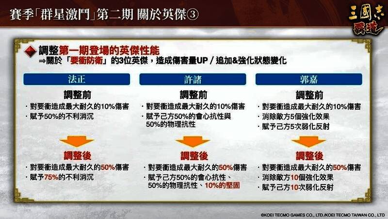 可以赋予减少部队兵力并使己方给予的状态变化无效的「毒铐」,以及使用战法赋予随著发生中的弱化效果数量给予伤害,并减少连锁机率的「夺魂」,可以大幅度的削弱敌人。