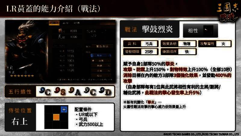 「LR 黄盖」是可使用强力火属性击心攻撃的弓兵武将。