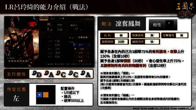 可以使用战法赋予包含自身在内的3个己方部队75%「有利激攻」,能大幅强化自身和我方。同时也很适合担任副将,「当吕玲绮为副将且主将为吕布/高顺/张辽/貂蝉/陈宫」开始交战时,可发挥赋予有利变化「愤怒」等多项强力的效果。