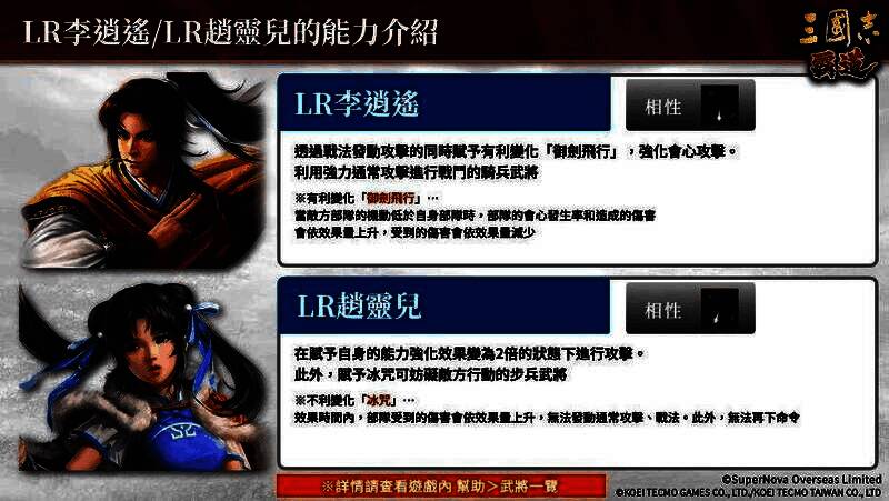 「LR 李逍遥」是能使用战法造成伤害,具有强力会心攻击的骑兵武将。