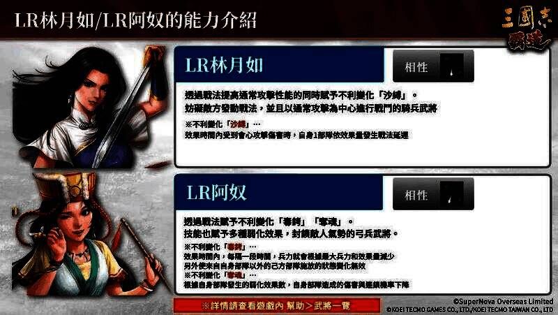 「LR 林月如」是能使用不利变化「沙缚」削弱敌人,辅助会心部队的骑兵武将。