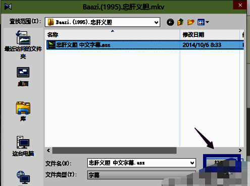 5.然后软件就会打开一个窗口,我们在里面找到下载好的字幕文件,一般字幕文件的后缀名为.ass,小伙伴们可以在网络上找到对应电影的字幕,下载即可。