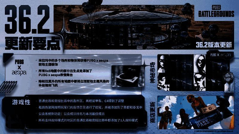 KRAFTON旗下的《PUBG: BATTLEGROUNDS》(以下简称《PUBG》)正式发布了36.2版本,此次版本上线了aespa联名活动及UGC初始版等备受玩家期待的内容。
