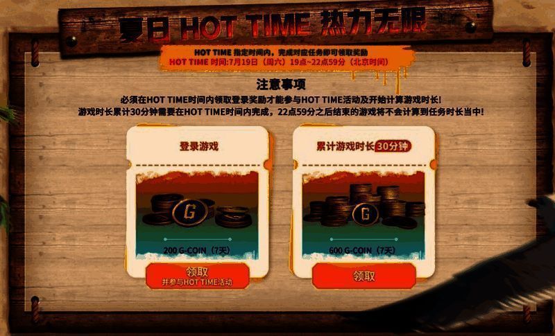 明日(7月19日)夏日同欢嘉年华就要开启HOT TIME时间,只要在19日晚上19点-22点59分期间登录游戏,并在这段时间内完成30分钟的游戏时长,即可累计领取800G-Coin(3天)!一定要注意的是19日22点59分之后结束的游戏不会计算在任务时长中!