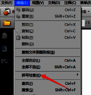 进行点击了编辑的菜单之后,弹出了下拉菜单选中为 拼写检查 的选项。
