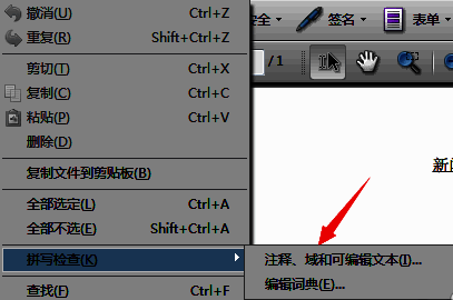 进行点击了拼写检查之后,弹出了下一级菜单选中为 注释和可编辑文本 的选项。