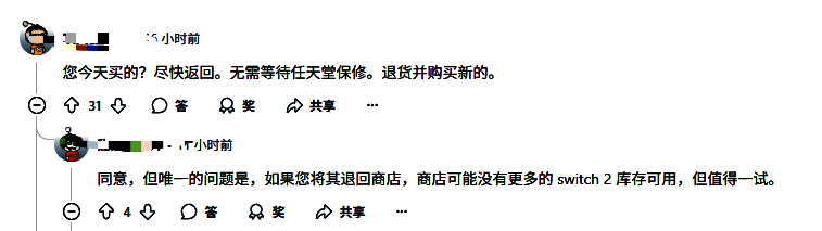 评论区许多玩家都建议Fiverings0退款。有玩家表示:“您今天买的?请尽快退回。无需等待任天堂保修。退货并购买新的。”但也有玩家提醒道:“这个方法是可行的,不过商店现在可能没有更多货了,不过仍值得一试。”