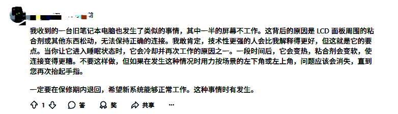 也有玩家解释,自己收到的一台旧笔记本电脑也发生了类似的事情,其中一半的屏幕不工作。这背后的原因是LCD 面板周围的粘合剂或其他东西松动,无法保持正确的连接。并表示一定要在保修期内退回,希望新系统能够正常工作。这种事情时有发生。