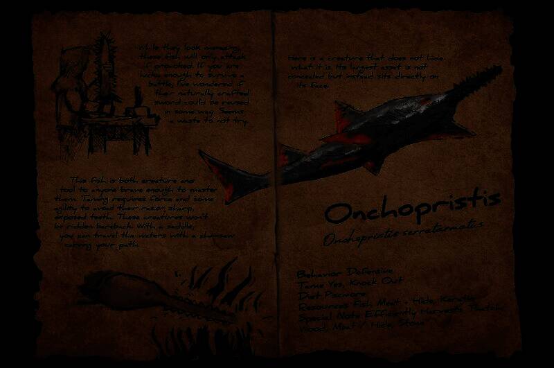 "对于敢于驯服它们的人来说,这种鱼既是生物,也是工具。驯服它们需要武力,还要足够敏捷来躲避它们锋利裸露的牙齿。这些生物不能赤背骑乘,必须装备鞍具。装备妥当后,你便能在水中畅游,用“电锯”劈开前方的道路。."