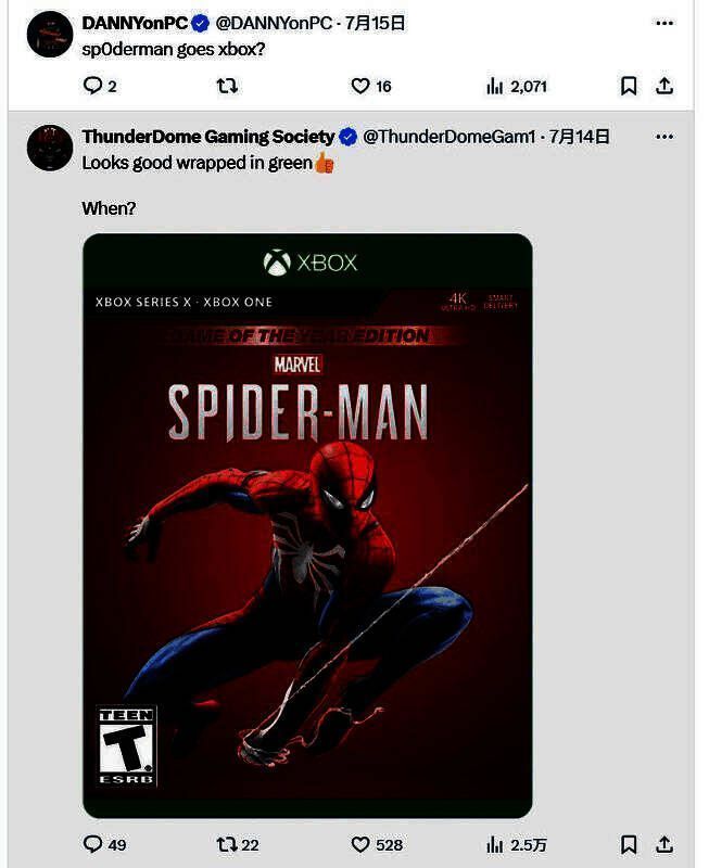 甚至有玩家PS了一张《漫威蜘蛛侠:年度版》登陆Xbox的游戏封面: