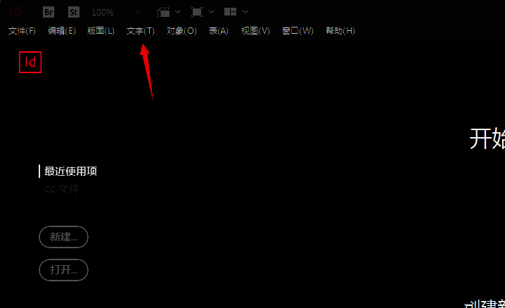 1.首先,打开InDesign界面后,点击上方的文字菜单