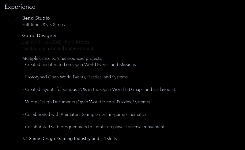 此后有报道称,该工作室已着手开发一款新游戏。近日,Bend工作室游戏设计师Jacob Fieth的LinkedIn资料显示,索尼或Bend管理层可能还在内部取消了多个其他项目。该资料表明,自2019年起,Fieth参与过“多个被取消/未公布的项目”。