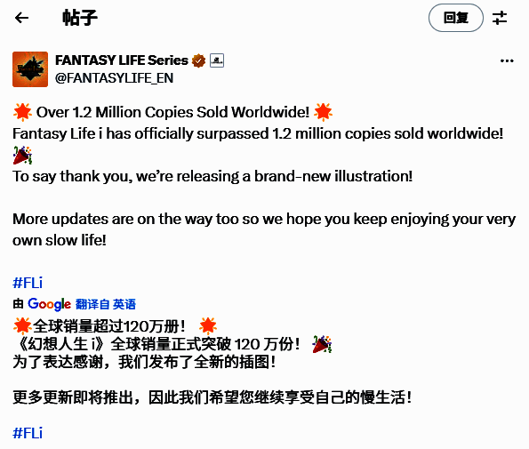 官方在推文中写道:“全球销量超过120万册!《幻想生活i转圈圈的龙和偷取时间的少女》全球销量正式突破 120 万份! 为了表达感谢,我们发布了全新的插图! 更多更新即将推出,因此我们希望您继续享受自己的休闲生活!”