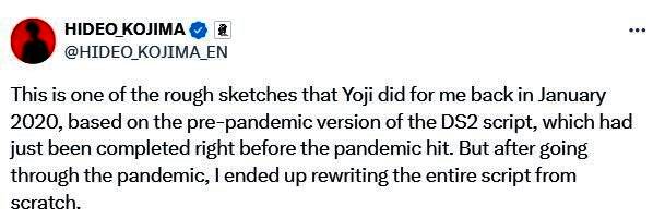 尽管《死亡搁浅2:冥滩之上》于今年发布,但其开发工作早在2019年就已启动。2020年1月,艺术家新川洋司根据游戏剧本的早期版本(现已被废弃)为主角们创作了多幅草稿图。这些草图——展现出与我们如今所知的《死亡搁浅2:冥滩之上》截然不同的氛围——最近由小岛秀夫公开,同时他也分享了一些关于剧本重写背后的思考。