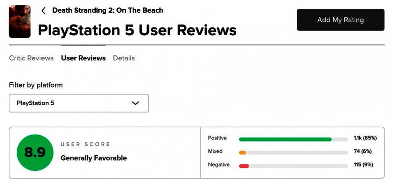 除了PSN外,《死亡搁浅2》在MTC上的用户评分也非常高,达到了8.9分(满分10分)。在1277个评价中,有85%的玩家给出了好评,只有9%的玩家打出了差评。