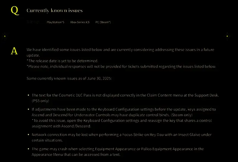 在 社交平台上,Capcom 提到:“我们已确认,当玩家在帐篷中通过‘外观菜单’打开‘装备外观’或‘随从猫装备外观’时,游戏可能出现崩溃。”