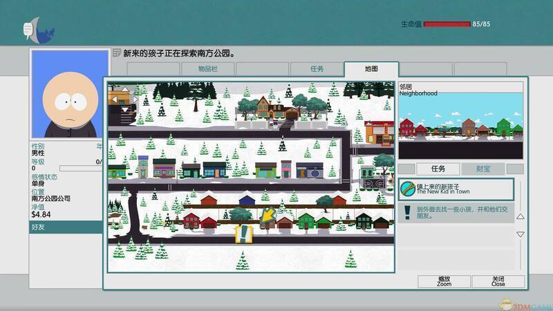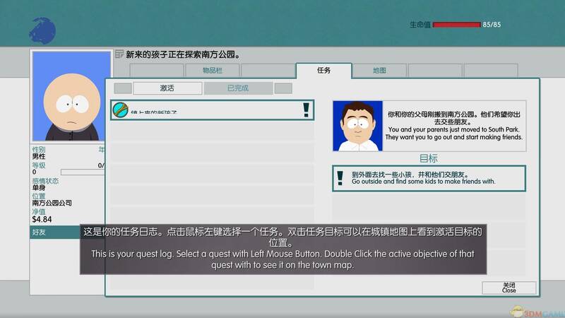 任务系统:游戏分主线和支线任务。主线任务是主要剧情,共十章,完成后自动接受下一个。支线任务独立,助玩家熟悉南方公园世界。