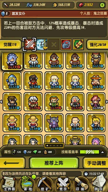 冒险系统:进入关卡可自动获取经验和金币,按秒计算收益,关卡越高收益越多。放置一段时间可获特有奖励和挑战资格,挑战成功进入下一关,最终关卡有机会得特色佣兵。